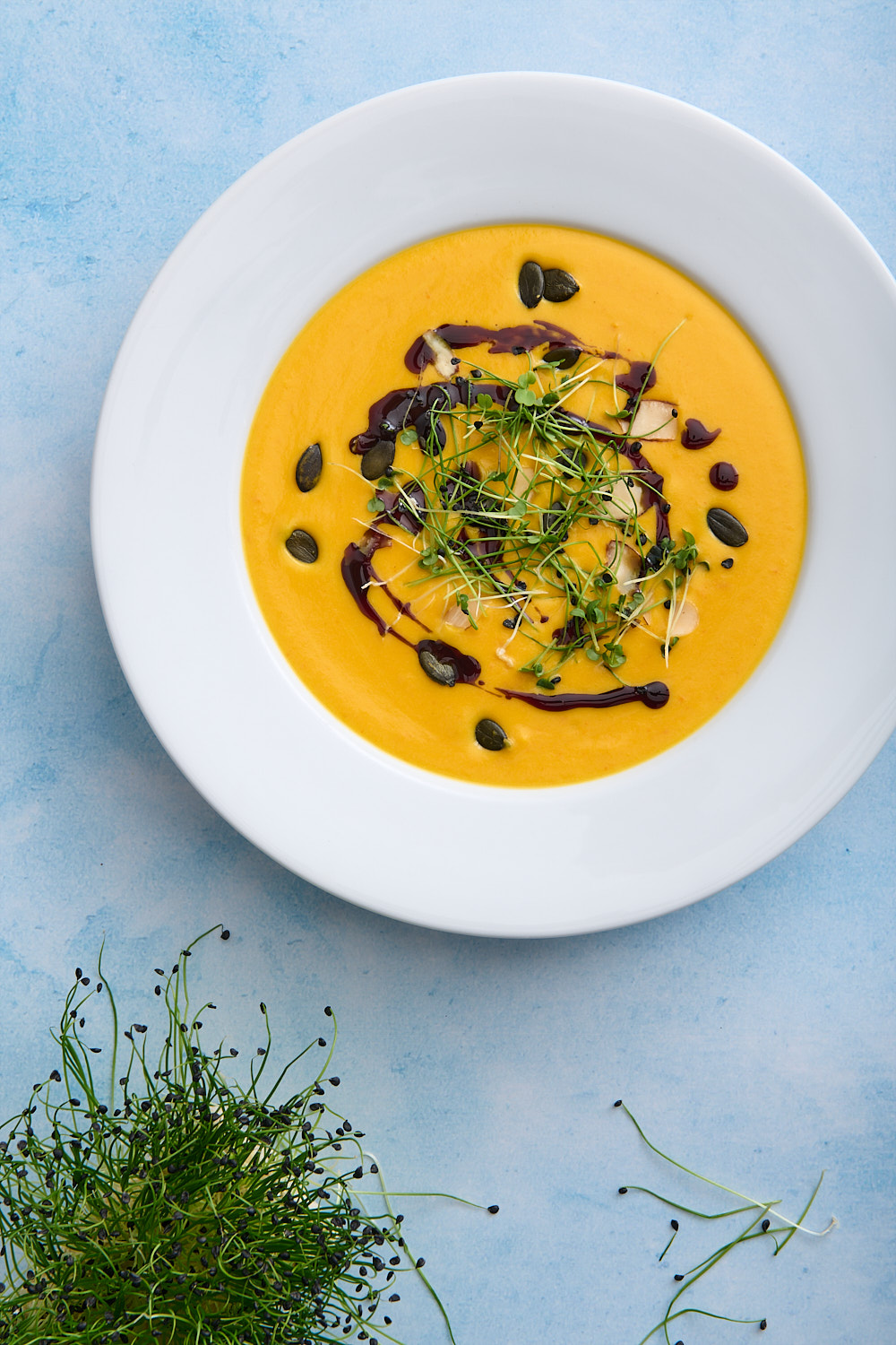 Kürbissuppe mit Kürbiskernöl und Sonnenblumen- Mandelkerne.