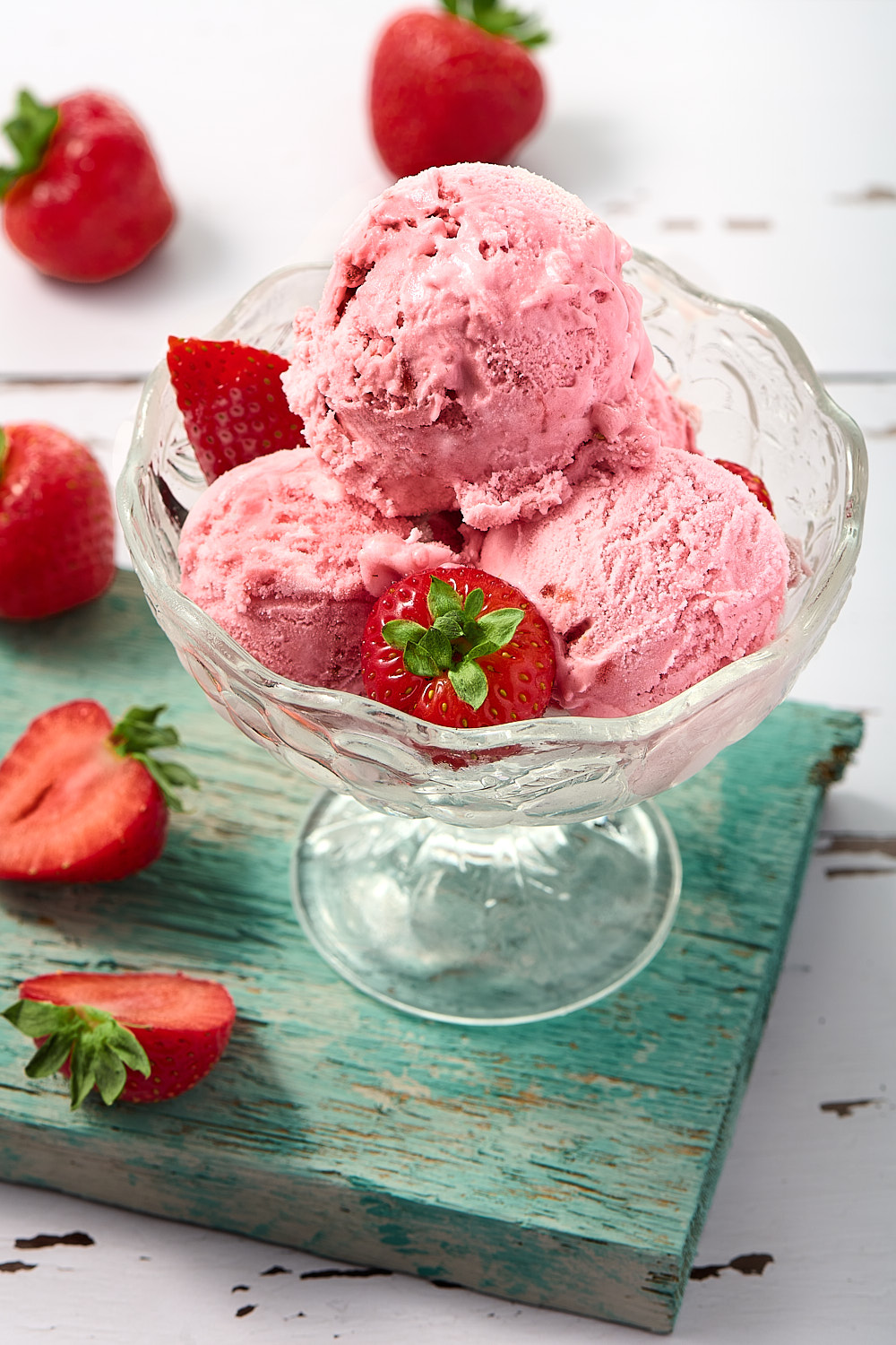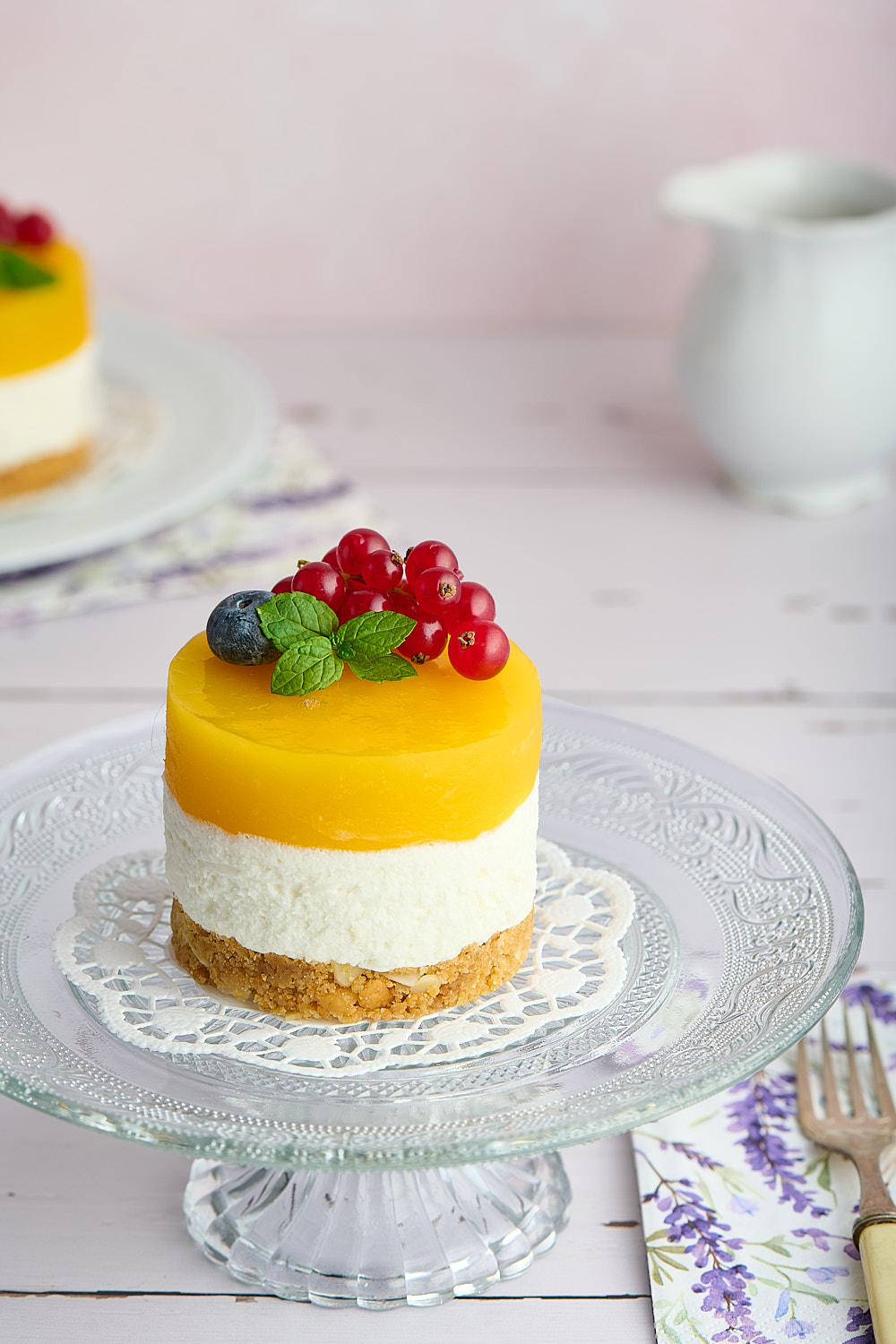 Mango Törtchen mit Beeren und Minze auf Glasteller – moderne Foodfotografie von Russell Flood