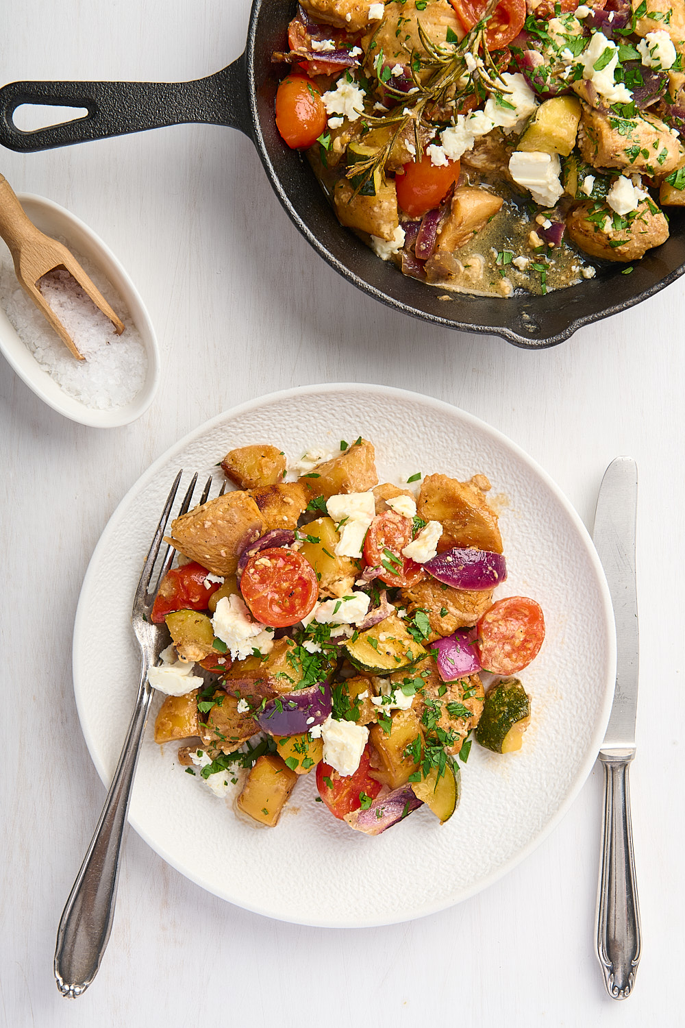 Foodfotografie Hähnchen-Kartoffel-Pfanne mit Fetakäse